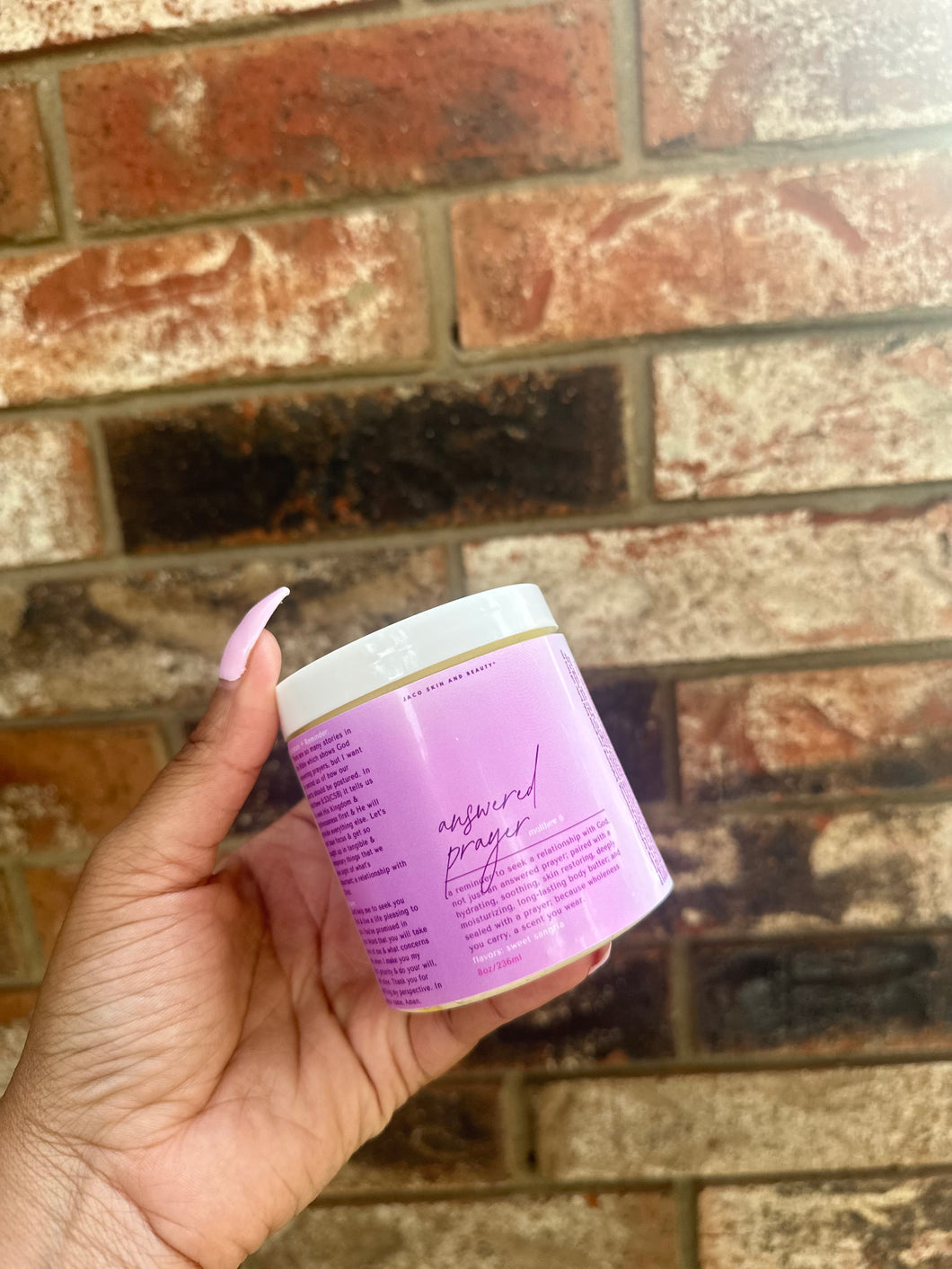 A reminder to seek a relationship with God, not just an answered prayer; paired with a hydrating, soothing, skin restoring, deeply moisturizing, long-lasting body butter; and sealed with a prayer; because wholeness you carry, a scent you wear.